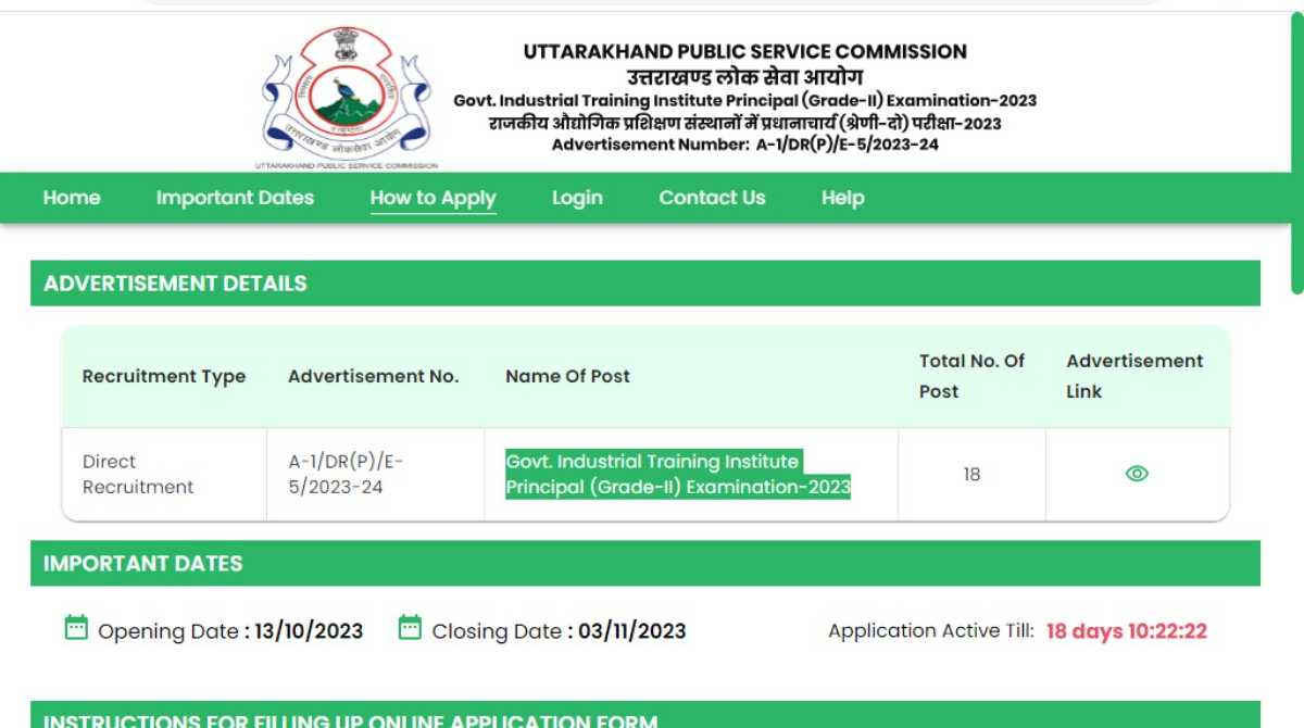 सरकारी नौकरी की तैयारी कर रहे लोगों के लिए खुशखबरी है। अब उत्तराखंड लोक सेवा आयोग यानी यूकेपीएससी ने समूह-ख के पदों पर भर्ती निकाली है। बताया जा रहा है कि आयोग ने आईटीआई प्रधानाचार्य ग्रेड-2 भर्ती का विज्ञापन जारी किया है। इन पदों पर आवेदन करने के लिए अभ्यर्थी आगामी तीन नवंबर तक ऑनलाइन आवेदन कर सकते हैं।