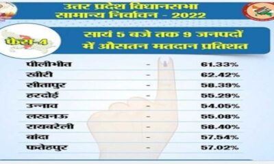 - 59 सीटों पर हुआ मतदान: यूपी में चौथे चरण चुनाव के लिए शाम 5 बजे तक 57.45% हुई वोटिंग, बढ़ सकता है आंकड़ा…February 23, 2022- लखनऊ: उत्तर प्रदेश विधानसभा चुनाव के चौथे चरण का मतदान खत्म हो गया है। चौथे चरण...