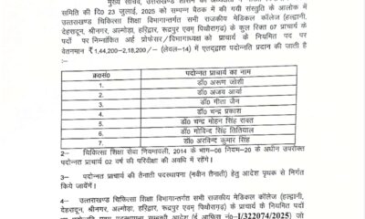 August 13, 2025उत्तराखण्ड चिकित्सा शिक्षा विभागान्तर्गत सभी राजकीय मेडिकल कॉलेजों—हल्द्वानी, देहरादून, श्रीनगर, अल्मोड़ा, हरिद्वार, रूद्रपुर एवं पिथौरागढ़—में प्राचार्य...