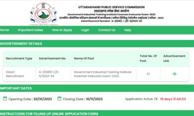 October 22, 2023युवाओं के लिए काम की खबर है। उत्तराखंड लोक सेवा आयोग ने राजकीय औद्योगिक प्रशिक्षण संस्थान...