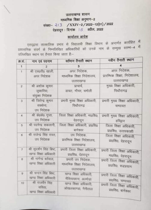 देहरादून: उत्तराखंड में एक बार फिर तबादलों का दौर शुरू हो गया है। शिक्षा मंत्री धन सिंह रावत ने विभाग में अधिकारियों के बंपर तबादले किए हैं। जिसकी लिस्ट जारी कर दी गई है। सूची के अनुसार विभाग द्वारा 21 अधिकारियों के तबादले किए गए हैं। देखें लिस्ट