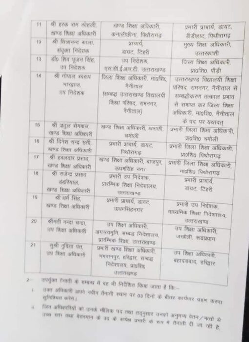 देहरादून: उत्तराखंड में एक बार फिर तबादलों का दौर शुरू हो गया है। शिक्षा मंत्री धन सिंह रावत ने विभाग में अधिकारियों के बंपर तबादले किए हैं। जिसकी लिस्ट जारी कर दी गई है। सूची के अनुसार विभाग द्वारा 21 अधिकारियों के तबादले किए गए हैं। देखें लिस्ट