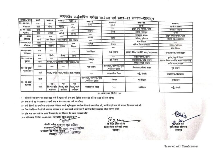 वहीं आज जारी हुए आदेश के मुताबिक जनपदीय गृह परीक्षा समिति द्वारा कक्षा 9 से 12 तक अर्द्धवार्षिक परीक्षा- 2021 का परीक्षा शुल्क 10.00 रू (प्रश्न पत्र शुल्क- 8.00 रू0, अंक पत्र शुल्क – 2.00 रू0) प्रति छात्र दर से तथा पैकिंग शुल्क 50.00 रू0 प्रति विद्यालय की दर से निर्धारित किया गया है। साथ ही अर्द्धवार्षिक परीक्षा 20= का परीक्षा कार्यक्रम संलग्न कर प्रेषित किया जा रहा है। परीक्षाएं 23 नवंबर से शुरू हो रही है। कक्षा 6 से 7 तक पहला पेपर गणित का होगा।