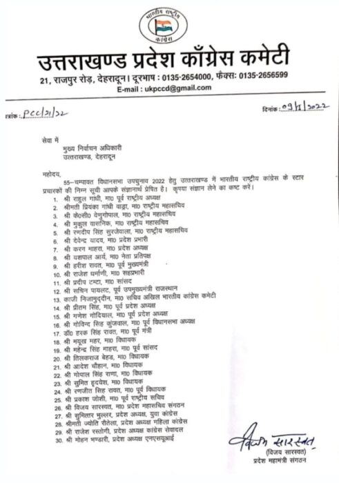 चंपावत उपचुनावः कांग्रेस ने जारी की 30 स्टार प्रचारकों की लिस्ट, ये दिग्गज नेता होंगे शामिल... - Uttarakhand Today