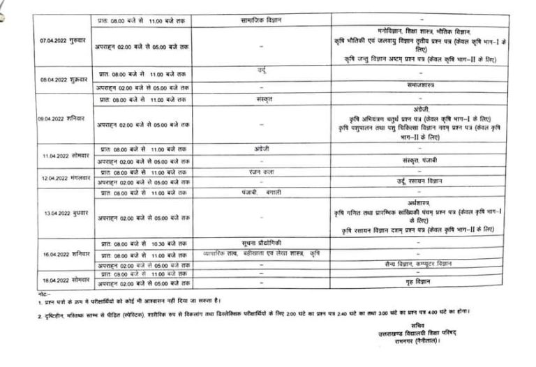देहरादून: उत्तराखंड बोर्ड के 10वीं 12वीं के विद्यार्थियों के लिए बड़ी खबर है। शिक्षा विभाग ने 10वीं-12वीं की बोर्ड परीक्षाओं का टाइम टेबल जारी कर दिया है।हाईस्कूल और इण्टरमीडिएट 2022 की लिखित परीक्षाएं दिनांक 28 मार्च, 2022 से शुरू होगी जो 18 अप्रैल, 2022 तक होंगी। उत्तराखण्ड विद्यालयी शिक्षा परिषद्, रामनगर (नैनीताल) द्वारा विस्तृत शेड्यूल जारी कर दिया है। 28 मार्च को पहला पेपर हिंदी का होगा।