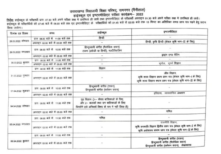 देहरादून: उत्तराखंड बोर्ड के 10वीं 12वीं के विद्यार्थियों के लिए बड़ी खबर है। शिक्षा विभाग ने 10वीं-12वीं की बोर्ड परीक्षाओं का टाइम टेबल जारी कर दिया है।हाईस्कूल और इण्टरमीडिएट 2022 की लिखित परीक्षाएं दिनांक 28 मार्च, 2022 से शुरू होगी जो 18 अप्रैल, 2022 तक होंगी। उत्तराखण्ड विद्यालयी शिक्षा परिषद्, रामनगर (नैनीताल) द्वारा विस्तृत शेड्यूल जारी कर दिया है। 28 मार्च को पहला पेपर हिंदी का होगा।