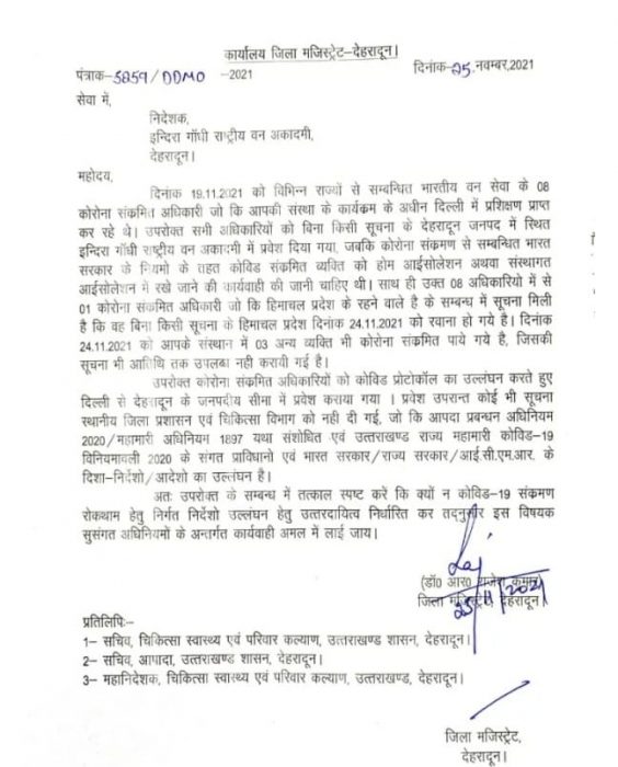 देहरादून: हिमाचल प्रदेश से आए देहरादून आए प्रशिक्षु आठ आईएफएस अधिकारियों के खिलाफ कार्यवाही के लिए लिखा पत्र । देहरादून के डीएम राजेश कुमार ने महामारी एक्ट के उल्लंघन करने पर भेजा नोटिस। वहीं डीएम राजेश कुमार ने एफआरआई के निदेशक को भी जारी किया नोटिस।