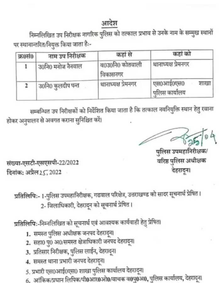 डीआईजी जनमेजय खंडूरी ने दो उपनिरिक्षको के तबादले किए है। आदेश के अनुसार उप निरीक्षक मनोज नैनवाल को कोतवाली विकासनगर से थानाध्यक्ष प्रेमनगर के पद पर भेजा गया है।