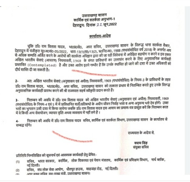 देहरादूनः विवादों में घिरे वरिष्ठ आईएएस अधिकारी राम विलास यादव को धामी सरकार ने सस्पेंड कर दिया है। बताया जा रहा है कि धामी सरकार ने आय से अधिक संपत्ति मामले में आईएएस रामविलास यादव को सस्पेंड कर दिया है। वहीं, अब रिटायरमेंट से पहले ही उनपर गिरफ्तारी की तलवार लटकती नजर आ रही है।