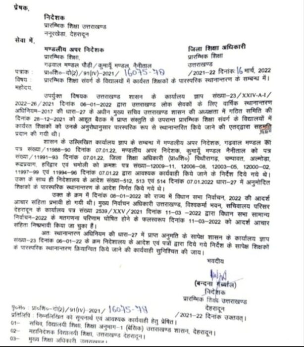 Big News: उत्तराखंड में आचार संहिता के चलते शिक्षा विभाग में स्थानांतरण पर लगी रोक हटाई, आदेश जारी…
