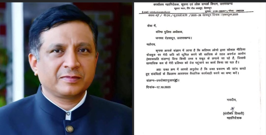 देहरादून। उत्तराखंड के सूचना महानिदेशक IAS बंशीधर तिवारी ने अपने खिलाफ सोशल मीडिया पर चल रही भ्रामक और आधारहीन खबरों को लेकर सख्त कदम उठाया है। उन्होंने एसएसपी देहरादून को औपचारिक शिकायत दर्ज कराई, जिसमें उन्होंने इस दुष्प्रचार अभियान से जुड़े पुख्ता डिजिटल सबूत भी सौंपे हैं।