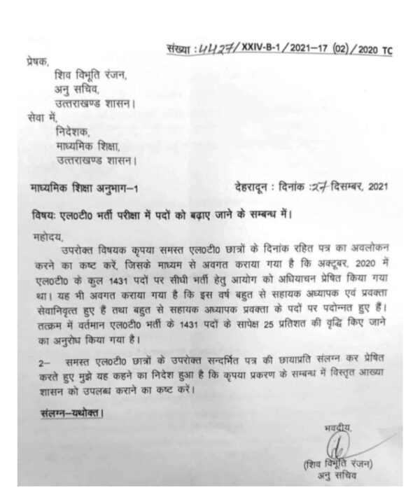 देहरादून: उत्तराखंड में बेरोजगारो के लिए अच्छी खबर है। शिक्षा विभाग में एलटी भर्ती में सरकार कुछ पद और बढ़ा सकती है। बेरोजगारों की मांग पर सरकार ने शिक्षा निदेशक से 25 % पद बढ़ाने की मांग के बाबत प्रस्ताव मांगा है। अक्टूबर 2020 में एलटी के कुल 1431 पदों 3 पर सीधी भर्ती हेतु आयोग को अधियाचन प्रेषित किया गया था। ऐसे में सीधी भर्ती के पद बढ़ाए जा सकते हैं, जिस पर अब यह आदेश जारी हुए हैं।