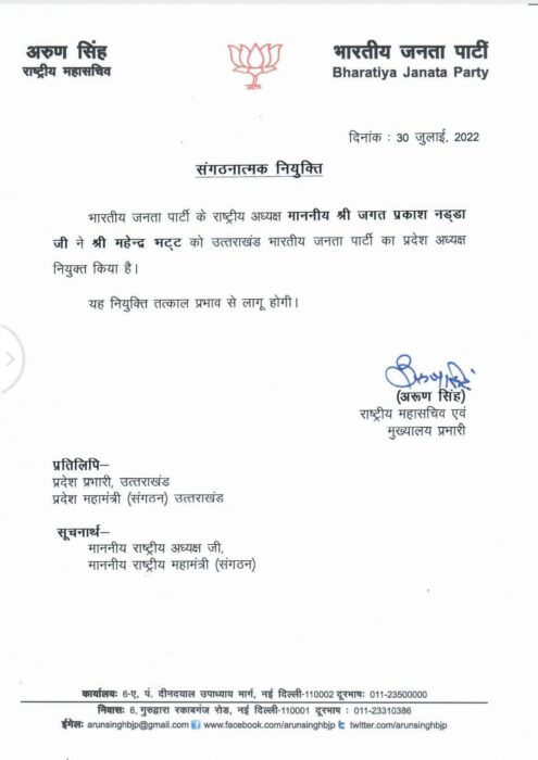 Big breaking: भारतीय जनता पार्टी के नए प्रदेश अध्यक्ष बने महेंद्र भट्ट…