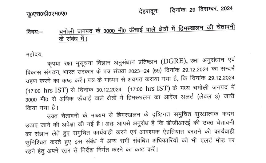 रक्षा भूसूचना विज्ञान अनुसंधान प्रतिष्ठान (DGRE), रक्षा अनुसंधान एवं विकास संगठन, भारत सरकार ने पत्र के माध्यम से अवगत कराया गया है, कि 29 दिसम्बर से 30 दिसम्बर के मध्य चमोली जनपद में 3000 मी० से अधिक ऊँचाई वाले क्षेत्रों में हिमस्खलन का आरेंज अलर्ट (लेवल 3) जारी किया गया है।
