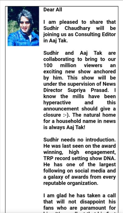 Sudhir Chaudhary Joined Aaj Tak As Consulting Editor: मीडिया रिपोर्टस के अनुसार सुधीर चौधरी के आजतक ज्वाइन करने की जानकारी इंडिया टुडे ग्रुप की वाइस चेयरपर्सन कली पुरी ने ट्वीट करते हुए दी है। उन्होंने लिखा है कि “सुधीर चौधरी और ‘आज तक’ हमारे 10 करोड़ दर्शकों के लिए एक नया और रोमांचक शो के लिए एक साथ हो रहे हैं, जिसके एंकर वही होंगे। ये न्यूज़ शो न्यूज़ डायरेक्टर सुप्रिय प्रसाद के मार्गदर्शन में लाया जाएगा। मुझे पता है कि लोग काफी चर्चाएं कर रहे होंगे, लेकिन इस खबर से उन्हें विराम मिलेगा। ख़बरों के लिए हर घर में स्वाभाविक रूप से एक ही नाम है और वो है – आज तक।”