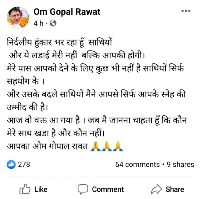 अब ओम गोपाल ने निर्दलीय लड़ने की घोषणा कर दी है तो सुबोध उनियाल की मुश्किलें भी जरूर बढ़ेंगी वैसे भी नरेंद्र नगर सीट का हिसाब किताब कुछ ऐसा ही है कि नरेंद्र नगर में सुबोध उनियाल की सीधी टक्कर ओम गोपाल से होनी है कांग्रेस बहुत ज्यादा प्रभावी इस सीट पर नहीं है आपको दिखाते हैं कि फेसबुक में ओम गोपाल ने आखिरकार क्या लिखा है।