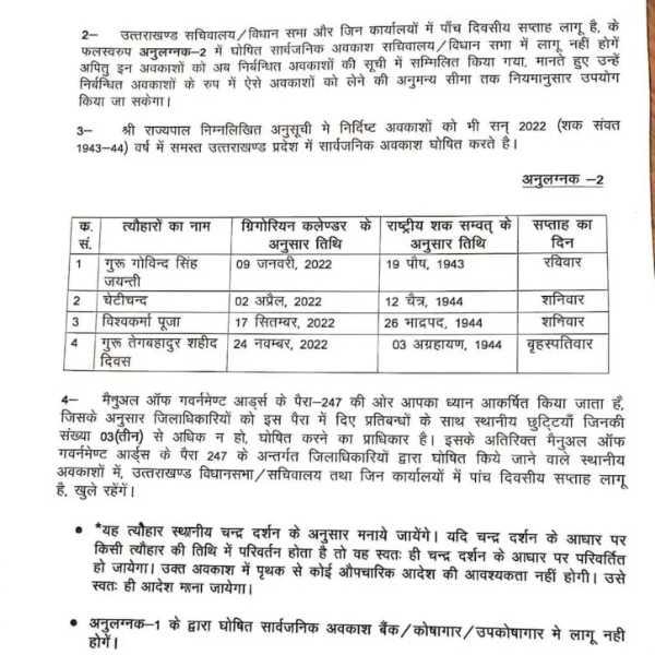 देहरादूनः दिसंबर का महीना खत्म होने के साथ ही नए साल की शुरूआत हो जाएगी। ऐसे में उत्तराखंड शासन ने वर्ष 2022 के सार्वजनिक अवकाशों की सूची जारी कर दी है। प्रदेश में इस वर्ष हरेला पर्व और छठ पर भी सार्वजनिक अवकाश होगा। लेकिन ईगास को जगह नहीं मिली है। वहीं सचिवालय व विधानसभा में पांच दिवसीय कार्य सप्ताह होने के कारण यहां के कार्मिकों को सार्वजनिक अवकाश अनुमन्य होंगे। इसके साथ ही शासन ने 18 निर्बंधित अवकाश घोषित किए हैं। देखें अवकाश लिस्ट..